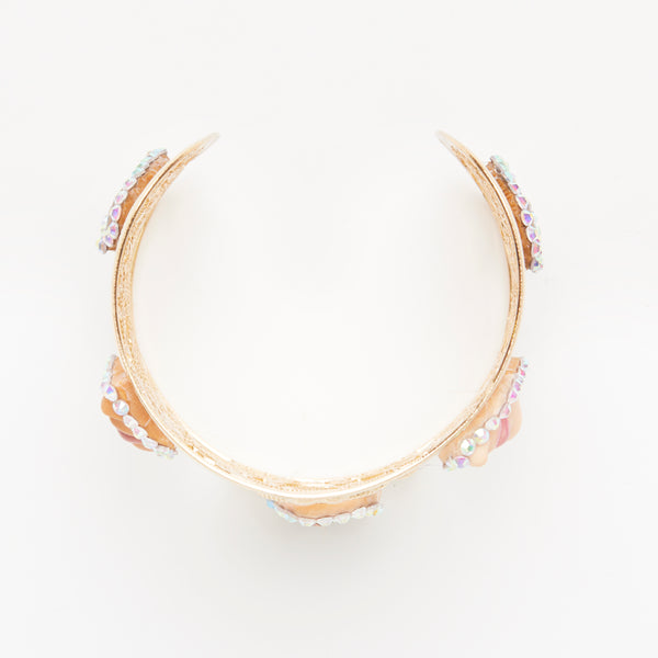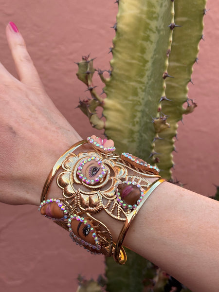 5 eyes & 3 mouthes of different skin colour handstiched on gold metallic bases adorned with Swarovski iridescent rhinestones gemstones placed one