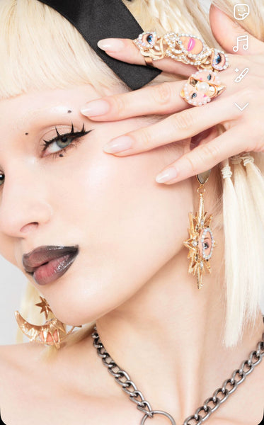 asymmetrical eyes & mouth mounted on gold metallic base with white iridescent Swarovski rhinestones placed around one by one with crystal & metallic grey gemstones